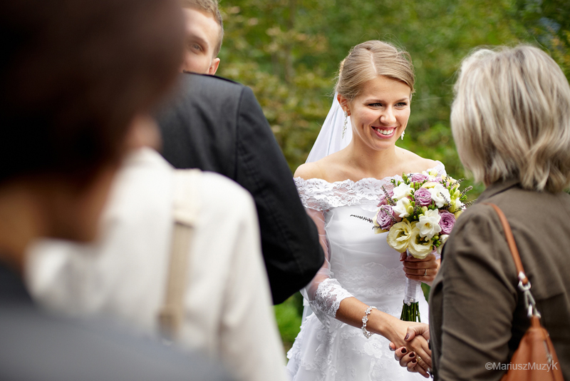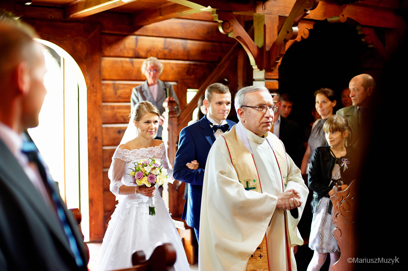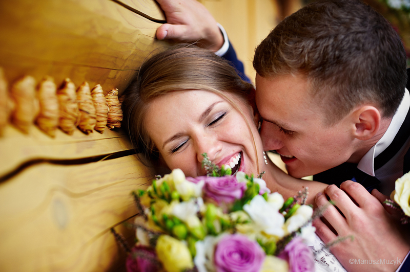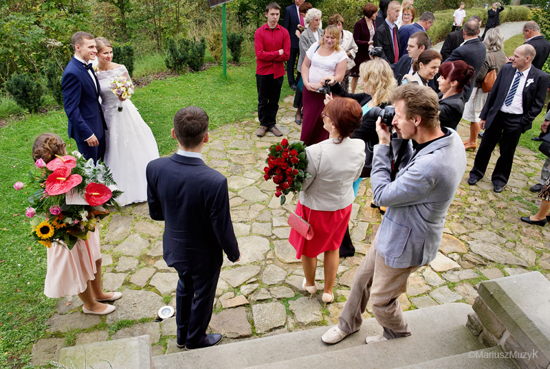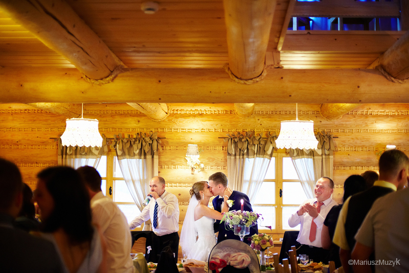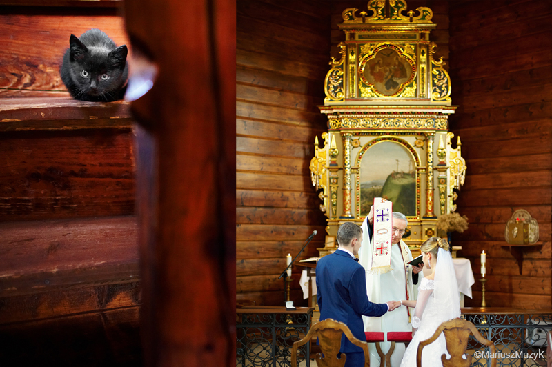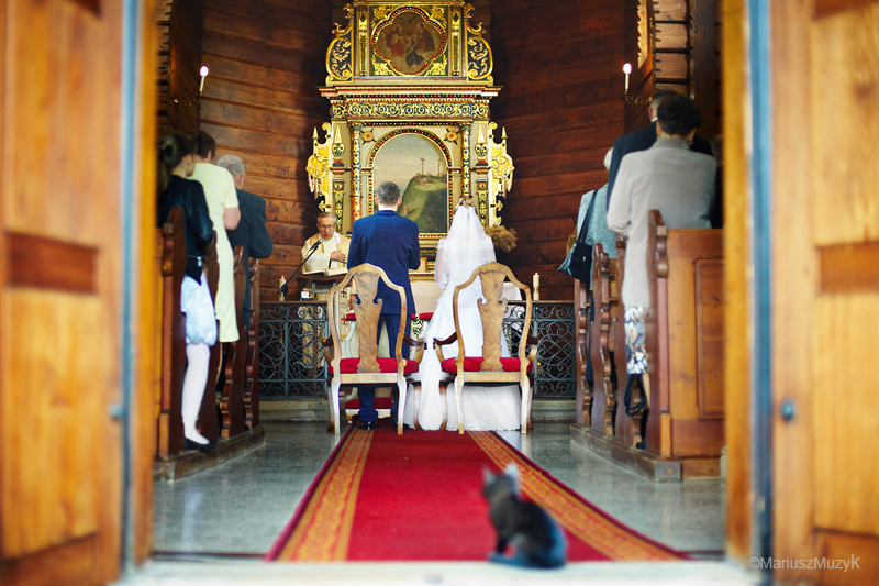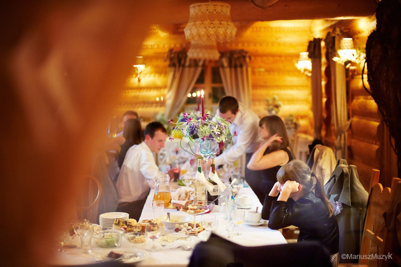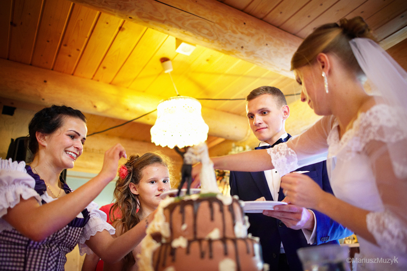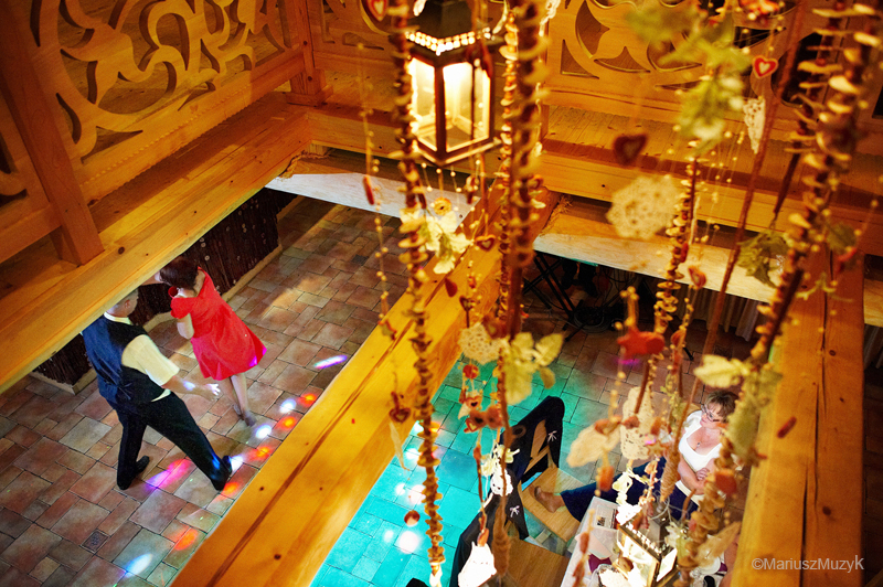 Dziś króciutki reportaż z Piernikowej Chatki w Wiśle. Ślub odbył się w kaplicy św. Jadwigi na zameczku prezydenckim w Wisła Czarne. Co prawda odprawa przed wejściem na teren rezydencji prezydenckiej wyglądała jak ta na lotnisku aczkolwiek warto było przejść wszystkie skanery, bramki etc. Kapliczka jest bardzo mała przez co to zapewnia kameralny klimat całej ceremonii. Celebrans również spisał się na piątkę – piszę o tym, bo niestety nie zawsze po ślubie pozostają w tej kwestii pozytywne emocje. Dodatkową „atrakcją” ceremonii ślubnej był mały czarny kotek, który od wejścia, poprzez przysięgę ślubną aż do wyjścia pary Młodej dzielnie towarzyszył weselnikom. Wesele odbyło się w Piernikowej Chacie, nieopodal Karolowego Dworu w Wiśle. Zapach, smak i wygląd tego miejsca to czysta cynamonowo-jabłkowa przyjemność. Ilość powieszonej cynamonowej kory oraz pierników jest naprawdę imponująca! Brawo dla tego kto wpadł na taki pomysł i wykonał go w tak detaliczny i szczodry sposób. Niewiele jest lokali weselnych budzących we mnie tak smaczne wspomnienia. Do tego wszystkiego Beskidy mieniące się całą paletą jesiennych kolorów i odcieni…Po prostu PIĘKNIE 😉
