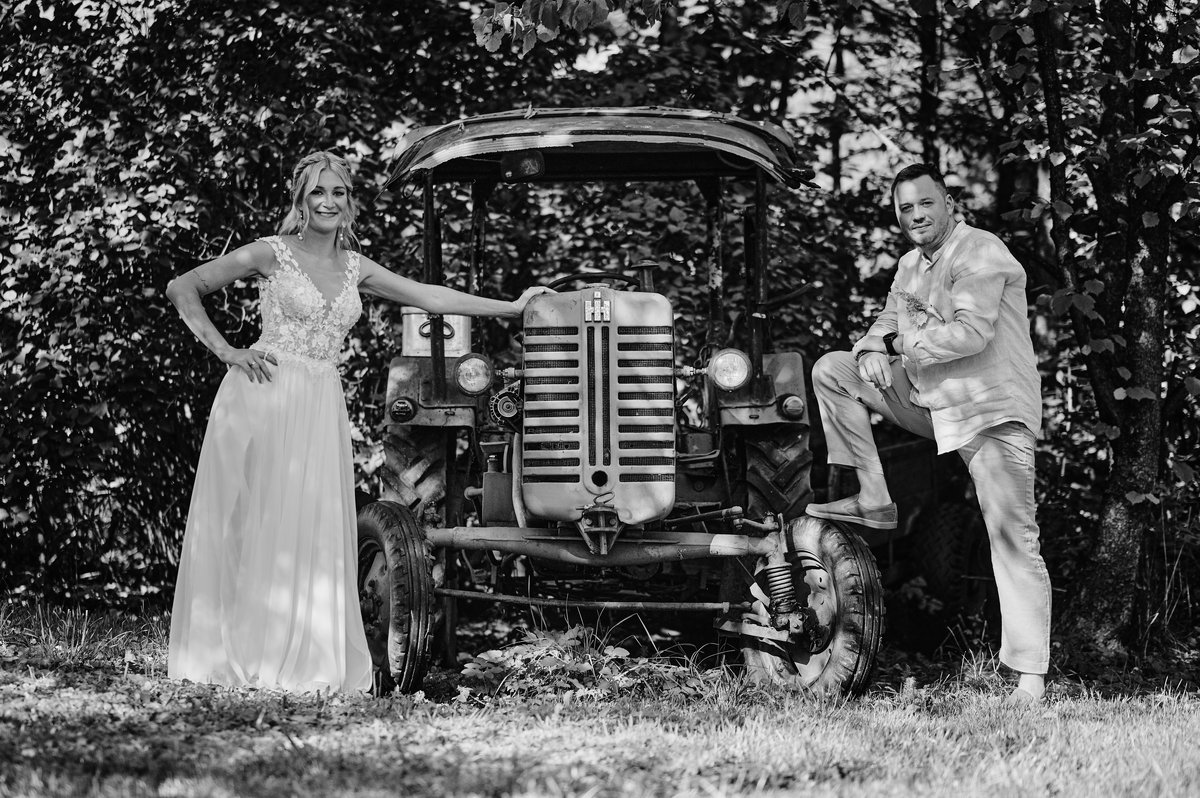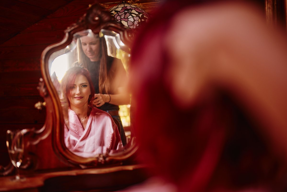 W takim miejscu jak Stary Tartak Pruchna, zdjęcia robią się niemal same. Każdy kąt siedliska – od drewnianych belek po widok na góry – stanowi naturalne tło, które nie potrzebuje wielu dekoracji. Styl retro boho idealnie współgrał z naturalnością Pary Młodej.