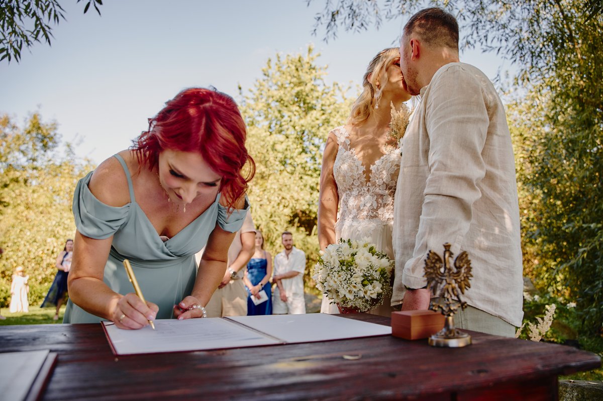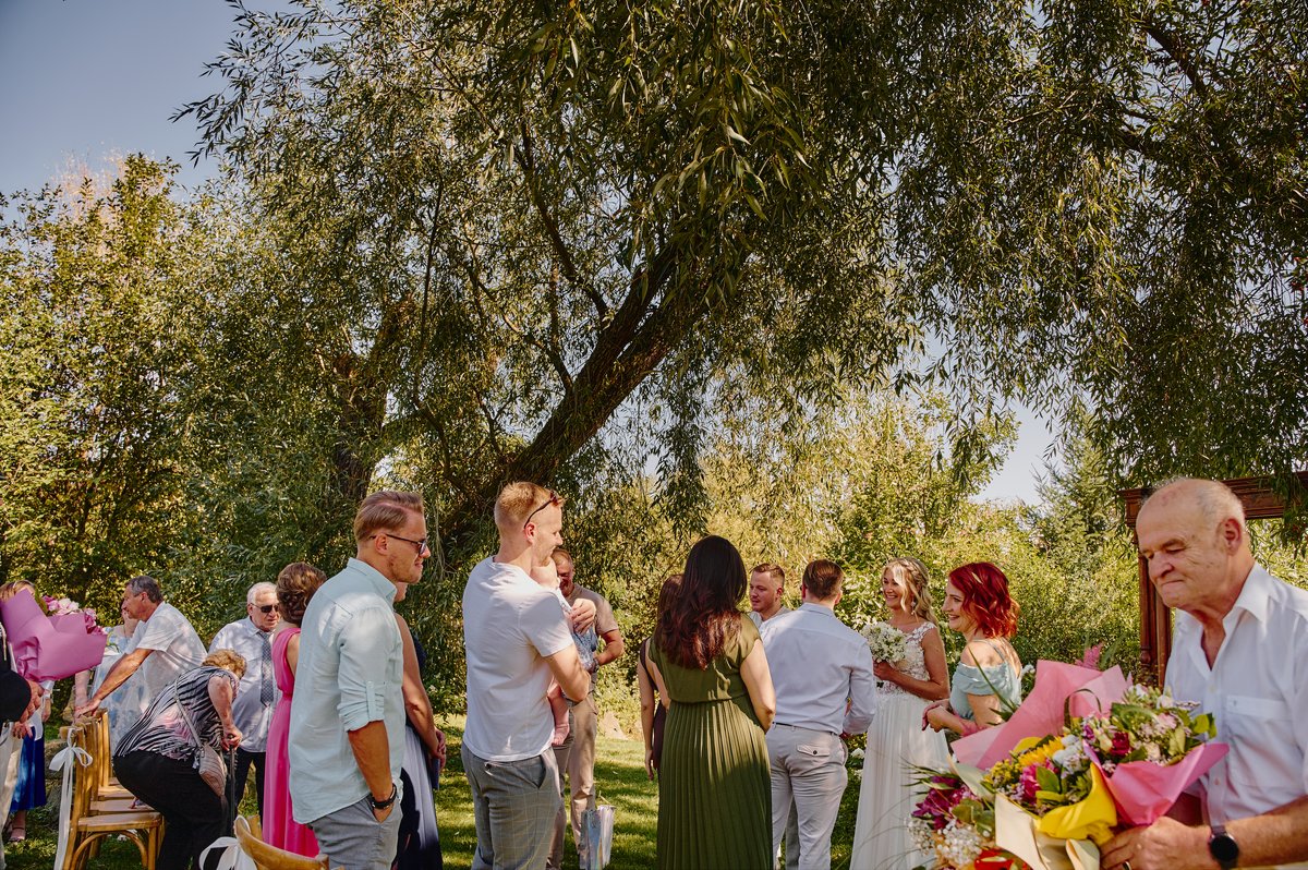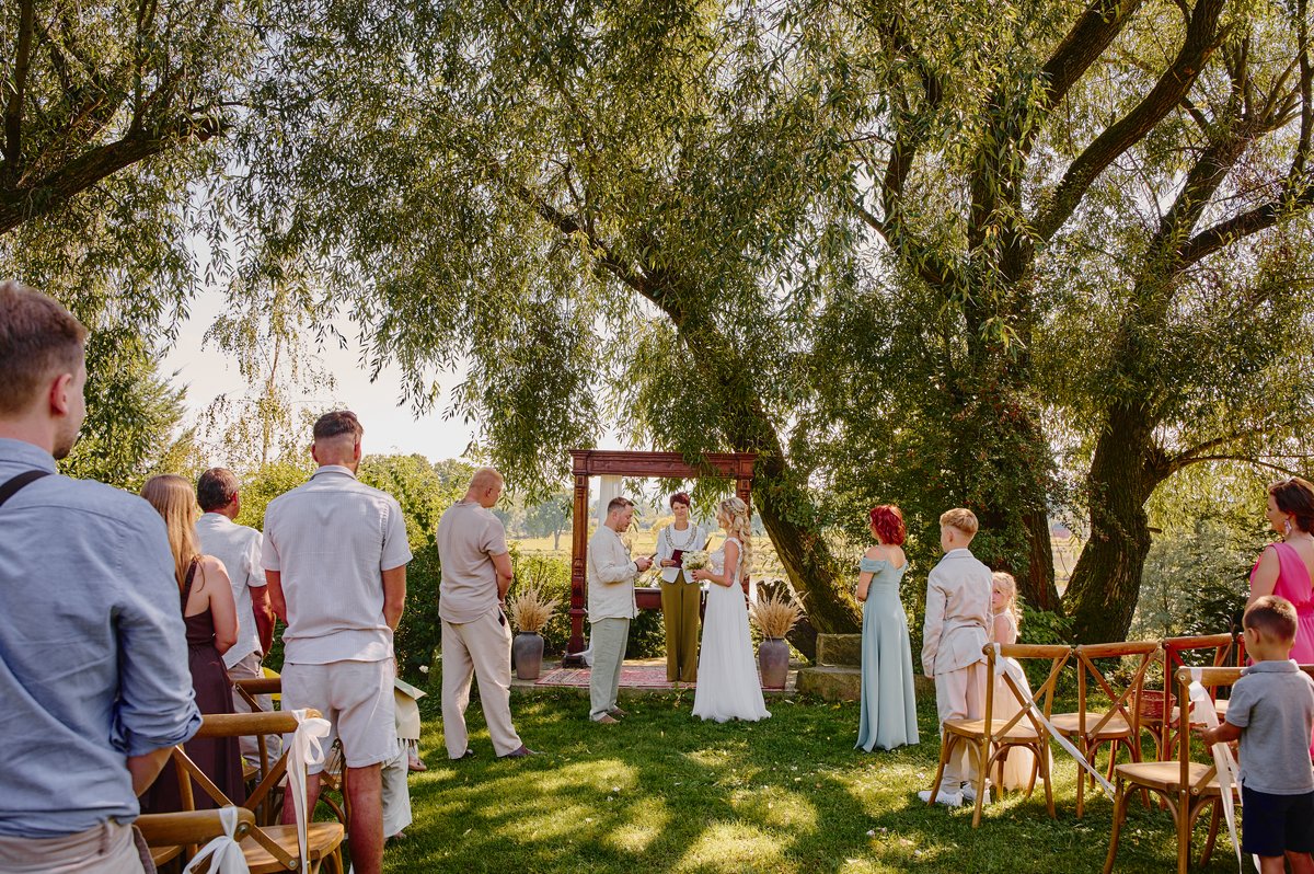 Dla Doroty i Mateja priorytetem był ślub na luzie. Nie mogło być więc lepszego wyboru niż tutejsze atelier pod starymi wierzbami. Wyobraźcie sobie: szum liści, delikatny wiatr od gór i przysięga składana w otoczeniu najbliższych, bez pośpiechu i stresu. To właśnie te momenty sprawiają, że fotografia ślubna nabiera autentyczności.
