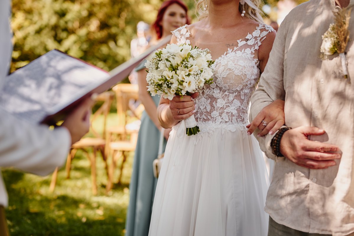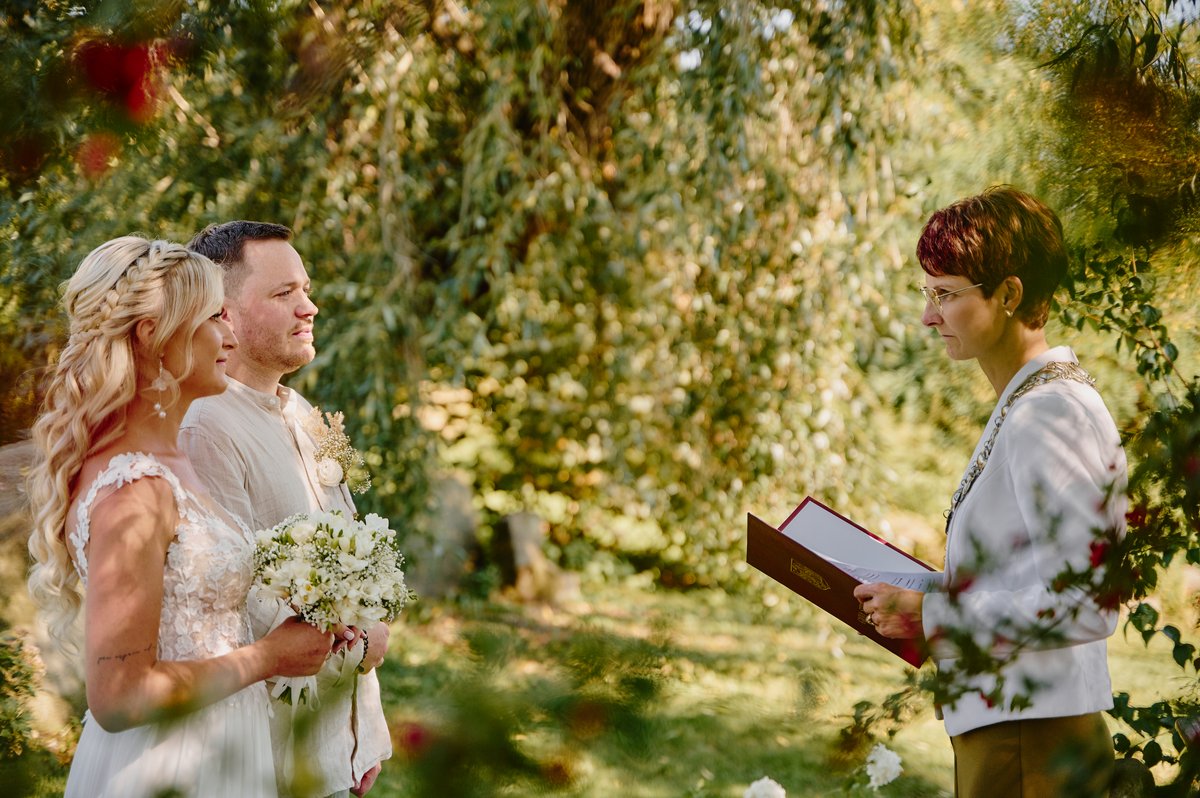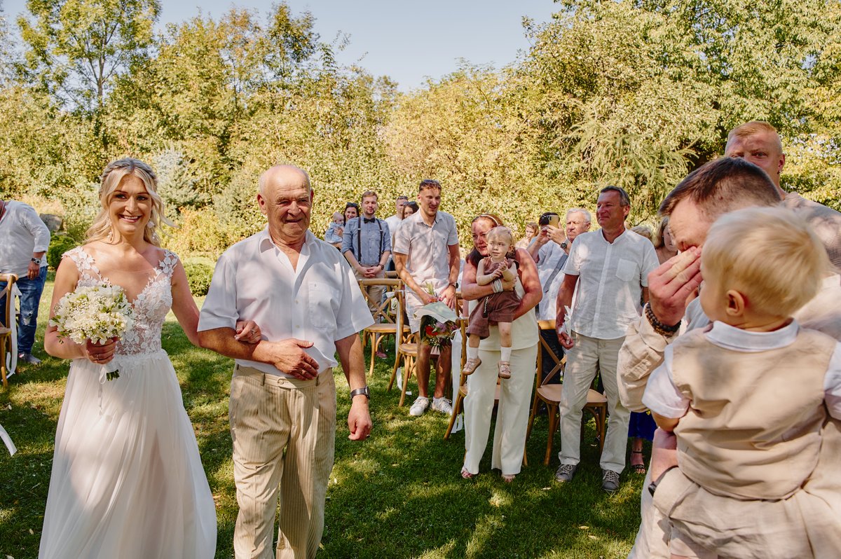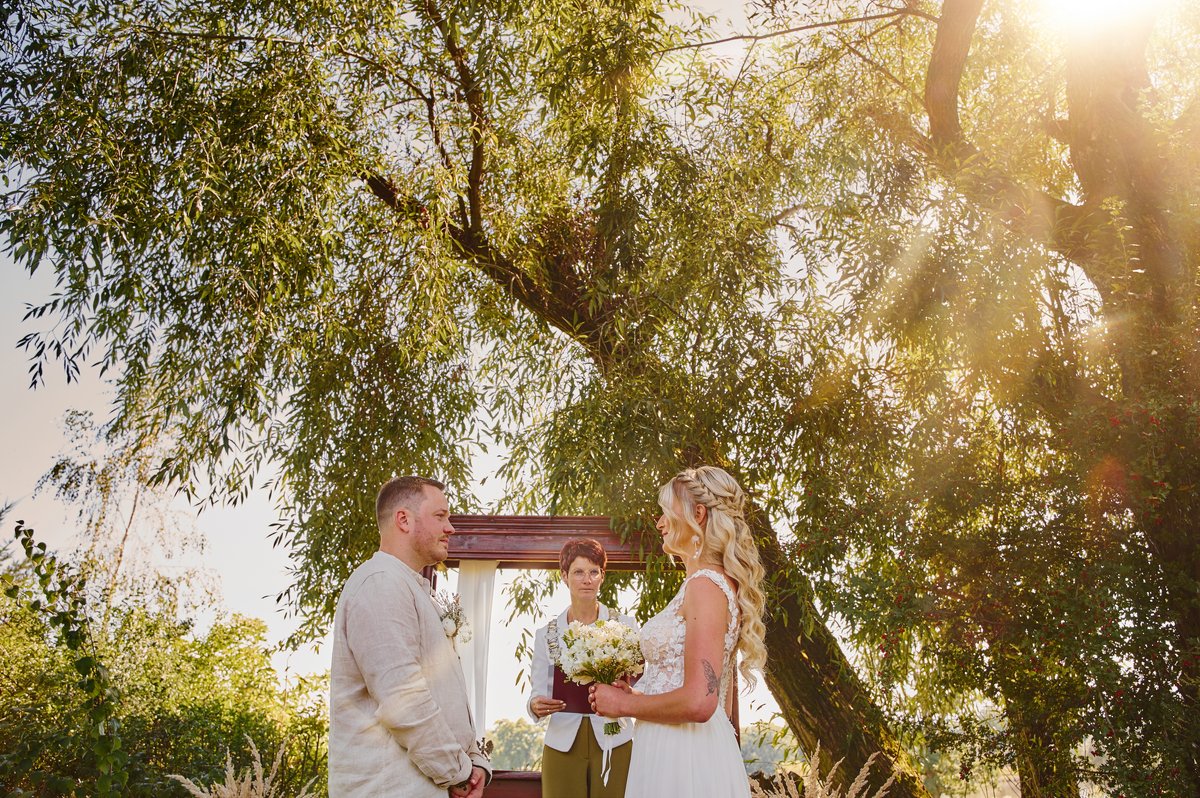 Dla Doroty i Mateja priorytetem był ślub na luzie. Nie mogło być więc lepszego wyboru niż tutejsze atelier pod starymi wierzbami. Wyobraźcie sobie: szum liści, delikatny wiatr od gór i przysięga składana w otoczeniu najbliższych, bez pośpiechu i stresu. To właśnie te momenty sprawiają, że fotografia ślubna nabiera autentyczności.